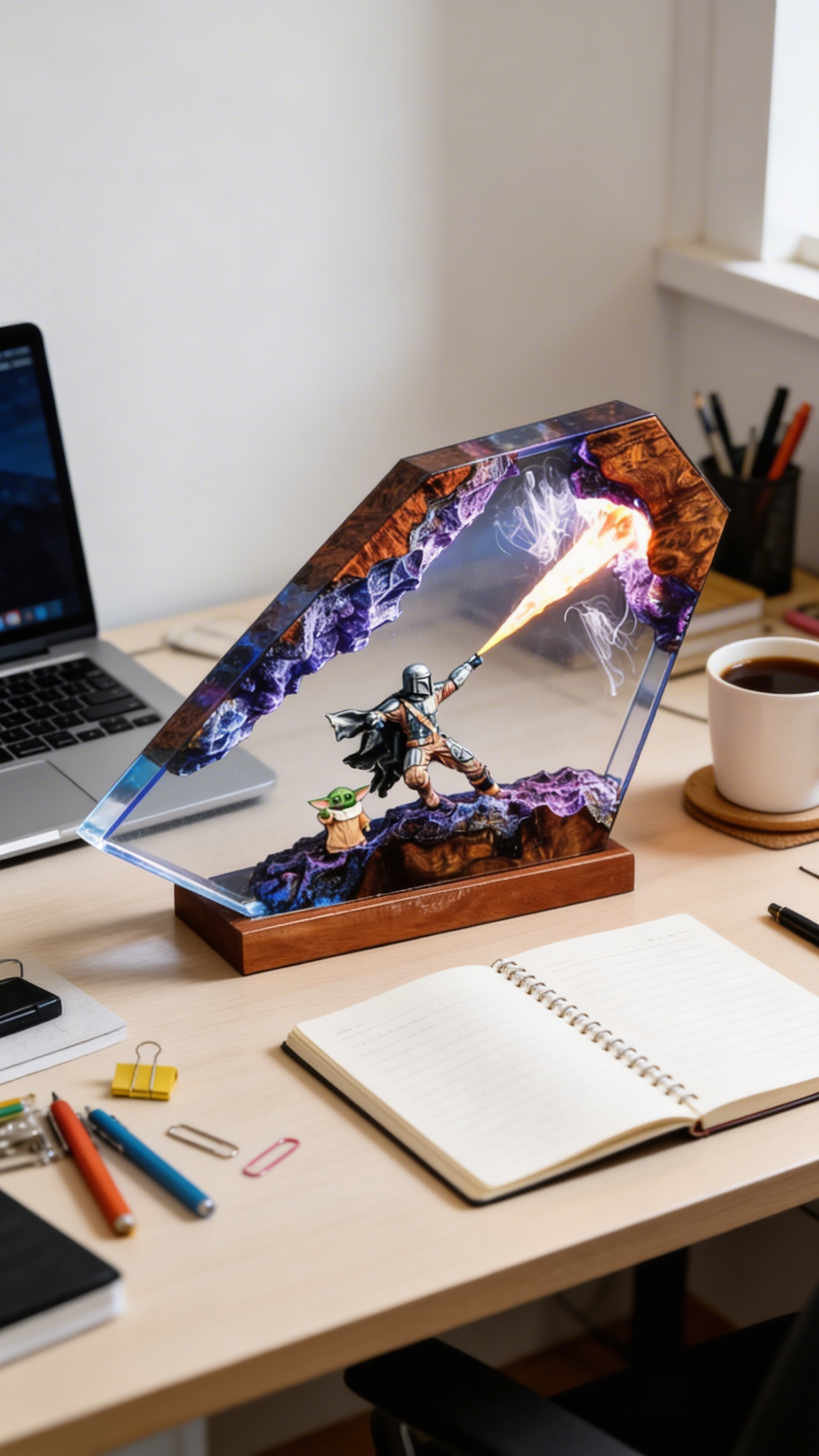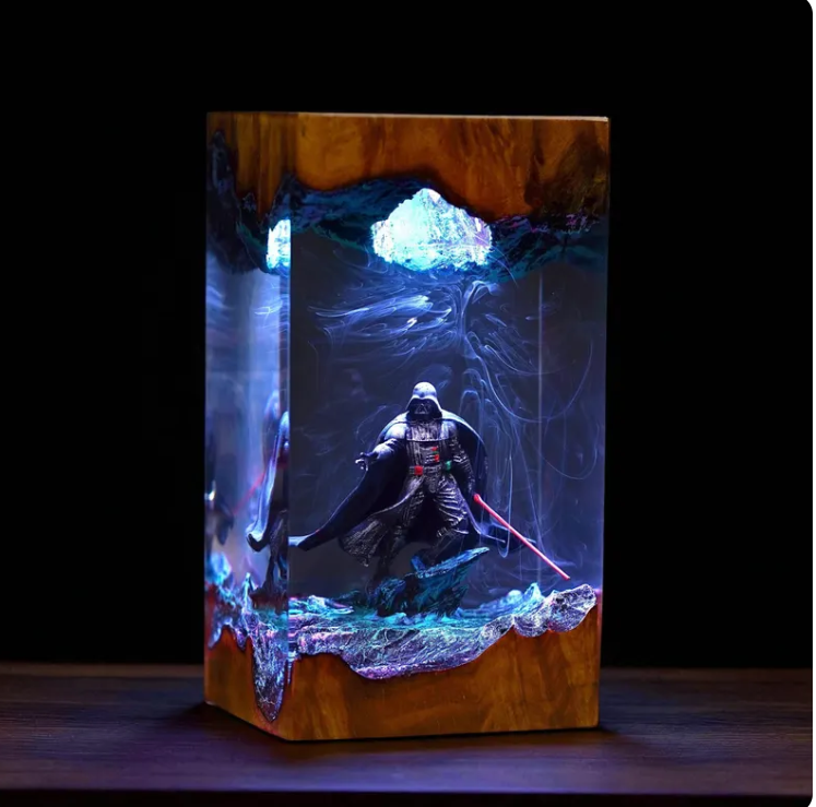hese aren't just lamps. They're frozen moments from the galaxy's most iconic battles, escapes, and standoffs — captured forever in hand-poured epoxy resin and real live-edge wood.