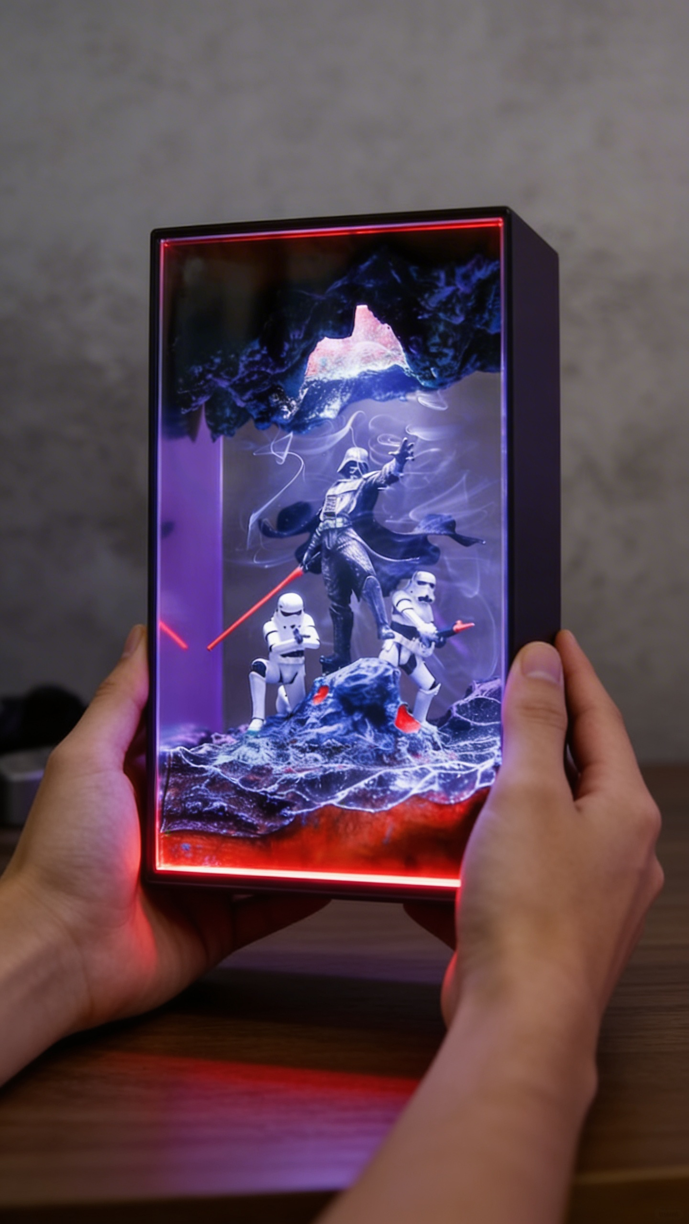 Inside each diorama sits a hand-placed figure locked in action — lightsabers drawn, engines burning, blasters raised. When the lights go off, the built-in LED system brings the entire scene to life. The resin catches the light and scatters it through the layers, creating a warm ambient glow that fills your room with the feel of a galaxy you grew up loving.
